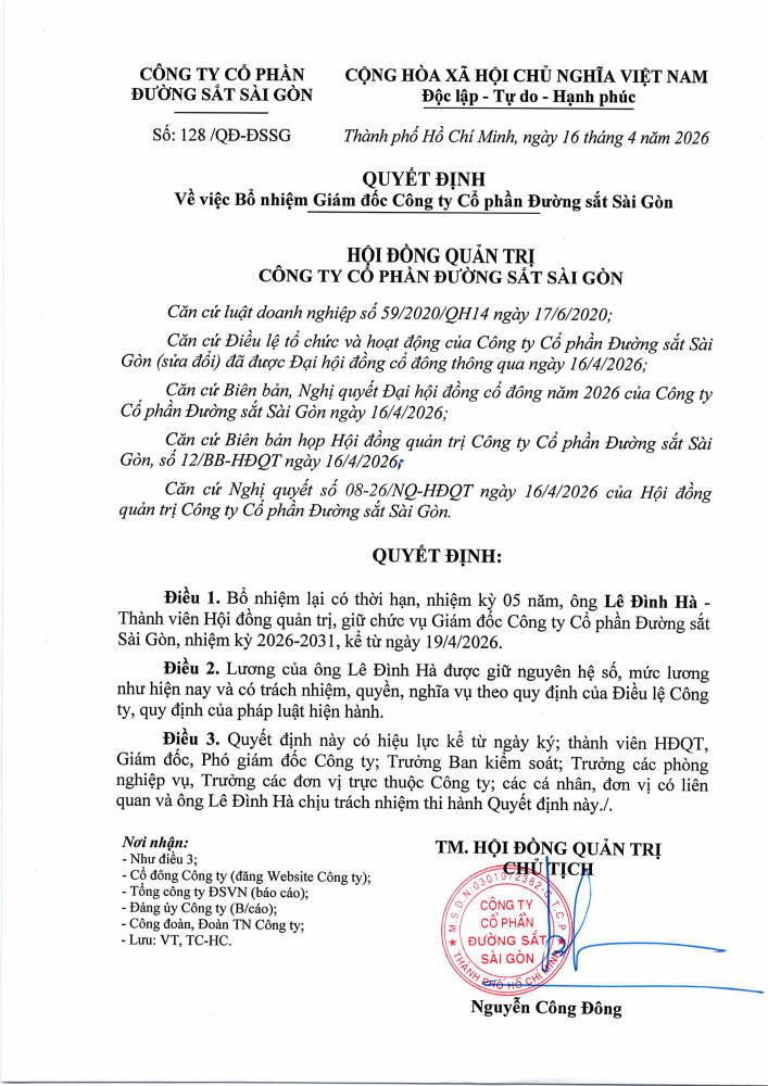 Quyết định Về việc Bổ nhiệm Giám đốc Công ty Cổ phần đường sắt Sài Gòn