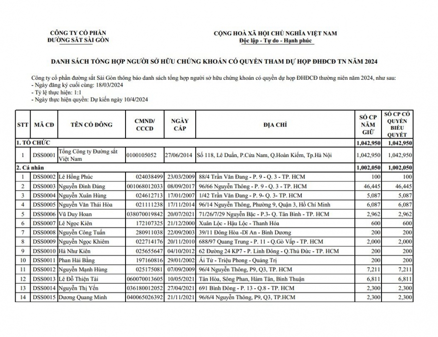 Danh sách tổng hợp người sở hữu chứng khoán có quyền tham dự họp ĐHĐCĐ thường niên năm 2024